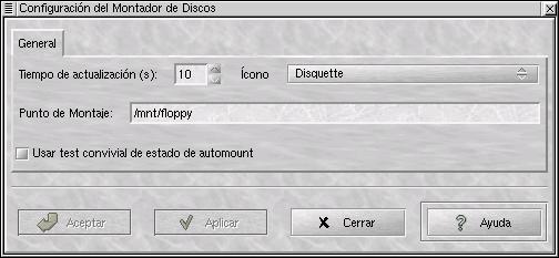 Pueden agregarse applets -apliques- que realizarán las funciones de montaje y desmontaje de las unidades de disco con un solo clic del ratón. Para agregarlos al panel se necesita hacer clic en le menú de GNOME y selecciónese Apliques > Utilerias > Montador de discos. Esto agregará un applet al panel (ver figura 2), al cual solo bastará configurar haciendo clic derecho sobre este y luego clic izquierdo en Propiedades para que surja la ventana correspondiente (ver figura 3). Especifíquese la ruta completa que corresponde al punto de montaje (ejemplo: /mnt/floppy). Se podrá también especificar un icono distinto si así se requiere. Hágase clic en aceptar. Cabe aclarar que dicho applet consume alrededor de 0.5 MB de RAM.