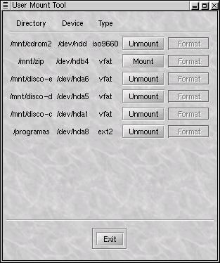 Es un programa incluido con la paquetería de utilidades -gnome-utilities- de GNOME. Se localiza en Menú de GNOME > Programas > Sistema > Disk management. Permitirá montar y desmontar las unidades de disco como son Floppies, unidades de CD-ROM y Zip Drives, siempre que estos estén especificados en el archivo /etc/fstab. Su funcionamiento es sencillo, bastará con hacer clic en los botones Montar o Desmontar. Proporciona, además, información de estado y permitirá dar formato a los disquetes (ver figura 1).